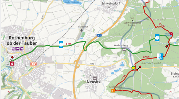 Wer diesem folgt erreicht damit nach 8 km die Stadt Rothenburg ob der Tauber und den Bahnhof.
